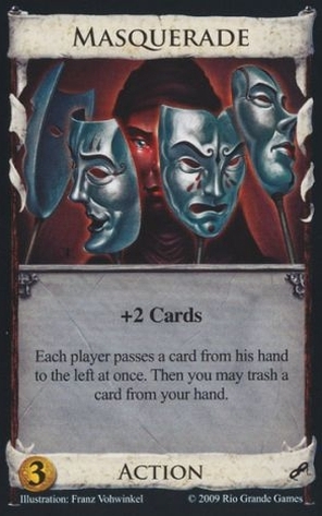 This is an especially cruel combo that baits your opponent into discarding his bad cards before forcing him to pass one of his remaining cards to you. While it doesn’t have quite the sting of a Possessed Ambassador (since your opponent will usually discard Victory cards rather than holding onto them), it can turn Masquerade into a much stronger attack than usual.