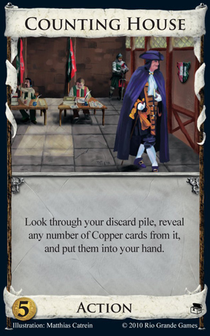 Counting House is best when you have your deck in the discard. Naturally, the obvious way to accomplish this goal is with Chancellor. The problem this faces is the sheer improbability of drawing your Chancellor, plus your Counting House, plus a +Actions card, amidst all your Copper. It’s OK, but pretty difficult to pull off.