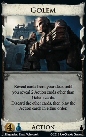 Top-decking the Golem is not nearly as helpful as it looks. Of course, it would be awesome to guarantee a Golem every turn, but remember if you don’t have a top-deck option, the Golem isn’t going into a discard pile where you have to wait several turns for a reshuffle. The deck gets shuffled *every turn*. So having 2-3 Golems generally gives you enough reliability to hit your Province (or Colony)-buying combo once every couple of turns anyways. If you don’t hit your Golem, you probably have a hand full of treasure, which you can use to buy smaller green cards, since they don’t really hurt you much.