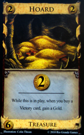 This is where Hoard comes in; it supplies your Salvagers with a constant stream of Victory cards.  You can grab Estates and Duchies to pick up free Golds, then crunch the Victory cards into cash with the Salvager.  And you’ll have so much Treasure in your deck that you can later afford to start trashing your Golds and Hoards for +$6, which is $3-$4 better than playing them (not to mention the +Buy).