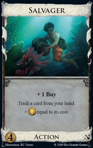 Salvager is a great opening buy, but it tends to stall once you run out of targets.  (This is true of most trashing cards other than Steward.) Salvaging Coppers is just not worth the effort; you’re essentially Cutpursing yourself for a +Buy.