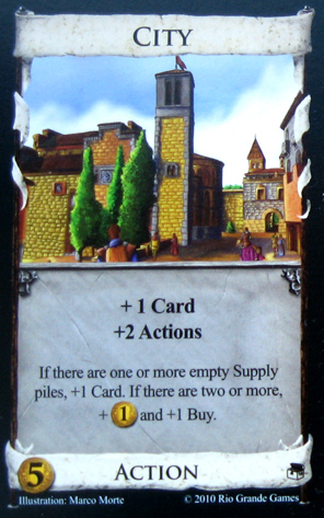 City is one of those cards very susceptible to groupthink. The first time anyone gets spanked by the Unstoppable City Stack (“UCS”), they vow that next game they will buy up the Cities themselves. This leads to a City race, which, of course, further powers up the Cities. Maxxed-out Cities are absolute juggernauts, easily drawing your deck with bonus money and Buys to boot.