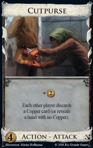 That having been said, it’s definitely a brutal attack in the early game.  Compare it to Militia, one of the best opening $4’s: in the early game, Militia is only superior if you draw no Victory cards.  But even then, Cutpurse is not really all that worse: this ordinarily means a hand of 5 Copper.  Militia drops you down to $3, and Cutpurse down to $4.  Either way, the damage is done: it’s cutting you off from the $5 that really hurts.  (The rare exception is if you hit a Silver + 4x Copper hand, whereupon Militia gets you down to $4 but Cutpurse only to $5.  But even then, going from $6 to $5 is still much worse than going from $5 to $4.)  And in multiplayer games, as alluded to before, Cutpurse stacks, but Militia doesn’t.