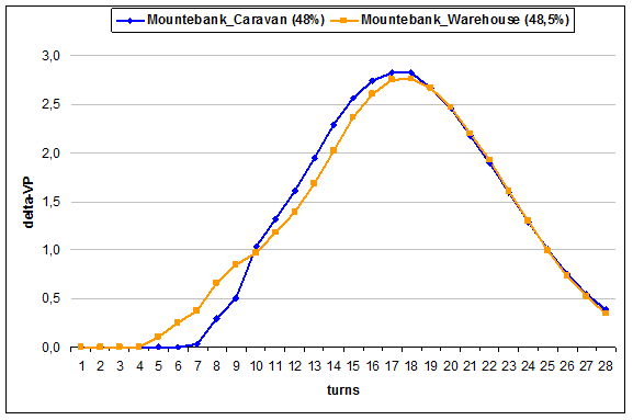 The extra Coppers and Curses from the opponent’s attacks severely hinder your buying power and getting some solid money in your pile is more important than being able to attack back as soon as possible. Buying Golds before Mountebanks gives the edge back to the Warehouse Player and enables it to get a head start as you see in the graph.