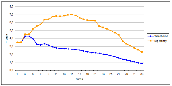 Surprisingly this strategy buys his first Warehouse when the game is already in the end phase. Now the Warehouse player wins 50% of the time while the Big Money player only wins 41% (9% are ties):