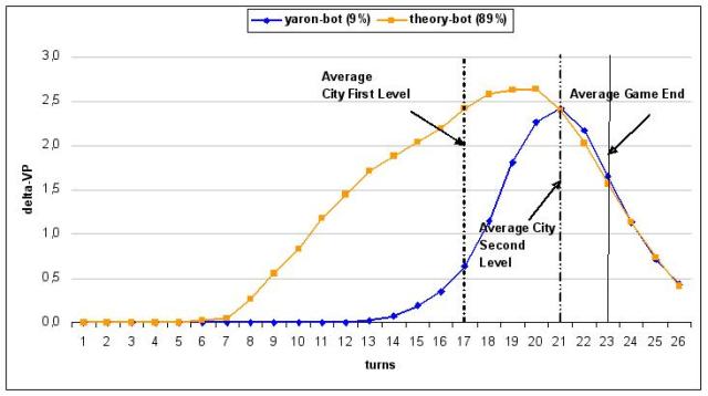 As this graph shows and some posters speculated, theory shouldn’t have been afraid of yaron’s so-called City advantage and could have completely ignored the City pile.  By ignoring cities, his winning percentage increases from 70% to 89%.