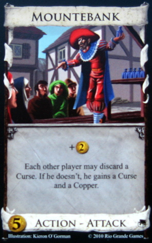 While sometimes mountebank will miss, one of the other effects is that by discarding a curse you’re not trashing it. Nothing is more frustrating than having my salvager or upgrade with a curse in hand only to get hit by a mountebank.