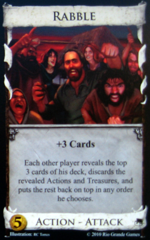 That having been said, the other $5 attacks are in a class by themselves.  Rabble isn’t quite as bad as Saboteur, but it’s got a long way to go before it can join the elite pantheon of attacks.  No other attack is as weak early on: in fact, this is one I’d almost certainly pass over for a peaceful $5 early on.