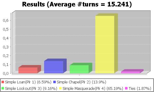 So Yaron’s Masquerade strategy beats the basic Coppersmith/Caravan which shouldn’t be too surprising (just check out councilroom). This still doesn’t tell us if DG’s Remodel will tip the game in his favor, but I have a feeling it might not. DG is playing a “big money”-strategy and doesn’t really use his Remodel to build an engine, but rather cycle his deck a little faster (buy turning Estates into Caravans) and as an aid to win the late game race for Victory Points. As I’ve noticed from my simulations, trashing will only help “big money” strategies out a little or not at all: