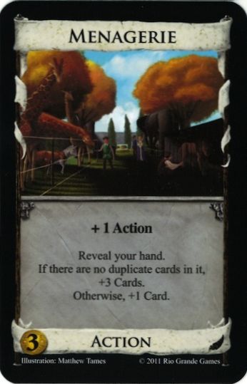 Naturally, Menagerie works well with all those Cornucopia cards that encourage or promote variety. It is a (very) soft counter to Cursing attacks and Swindler, which tend to give you cards you would not have bought.