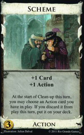 • Scrying Pool: This card’s only weakness in an Action-heavy deck is that you might not  play it every turn.  Scheme solves that problem, and Scrying Pool returns the favor by drawing the Scheme back into hand.