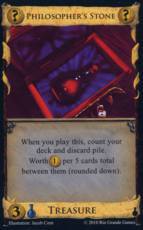 Another trap players fall into is buying a few Silvers or Golds or other stuff because Herbalist is awful and “I’ll get them when I hit $2”. WRONG!!! The turns you’re not buying Philosopher’s Stones should be spent buying Herbalists, more Herbalists and then some. It’s invaluable in the greening stage to put back the Stone each turn and the +buy will bloat your deck to make those Stones truly massive.