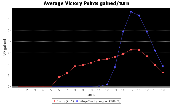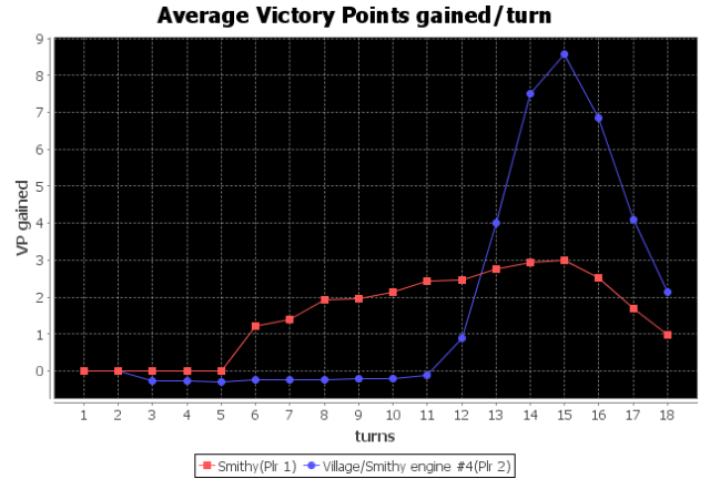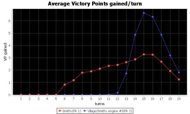 Here’s a view of this engine vs the Big Money Smithy deck (the graph shows the AVERAGE Victory Points gained each turn over 10,000 games which explains why there are no peaks to 6VP):