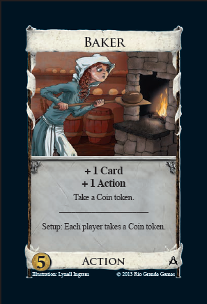 Baker has another special twist, which is, it gives players a coin token at the start of the game. You only get one coin token then, not one per Baker in the pile, why is anyone even asking that. You get the coin token even though no-one has a Baker yet and possibly no-one will end up buying one. It’s a free sample.