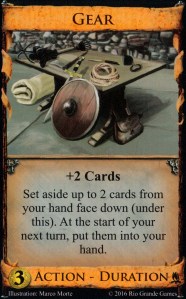 At first glance, Gear looks similar to Moat: +2 cards and some additional text. But it’s this additional text that enables Gear to provide so much control over your turns, and makes Gear one of the strongest cards in Dominion. Let’s look at all the valuable things you can do by setting aside cards with Gear: