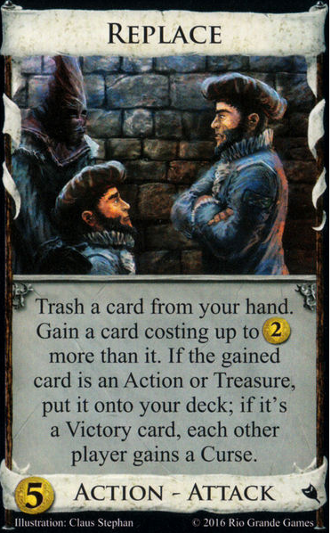 One rule of thumb in Dominion is that $5 costs are much stronger than $4 costs. Replace is Remodel, except with some tricks. It Curses when you gain a Victory card, and topdecks the card if you don’t. Is this really worth the jump from $4 to $5?